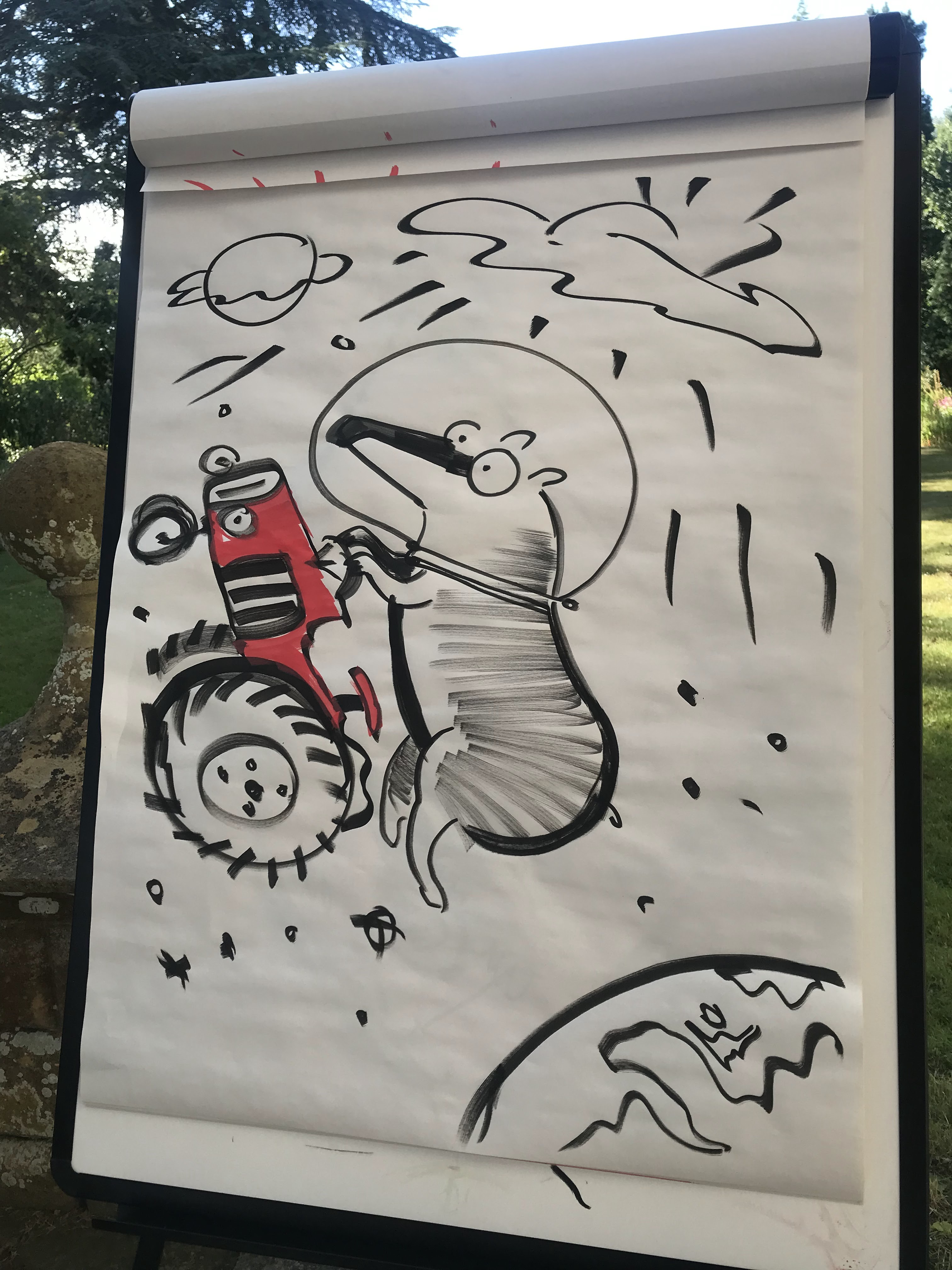 The next drawing game came form a conversation with author Josh Lacey on a train travelling to a school event we were attending together. During the conversation I nonchalantly announced that "I can draw anything". Thinking this a little arrogant, Josh asked the pupils at the school to come up with impossibly difficult things for me to draw as a challenge to the illustrator. We discovered that this was not only very funny but also a great way to begin a story narrative and set the pupils thinking about writing. This proved such good fun that we incorporated it into our school events and added a few rules...